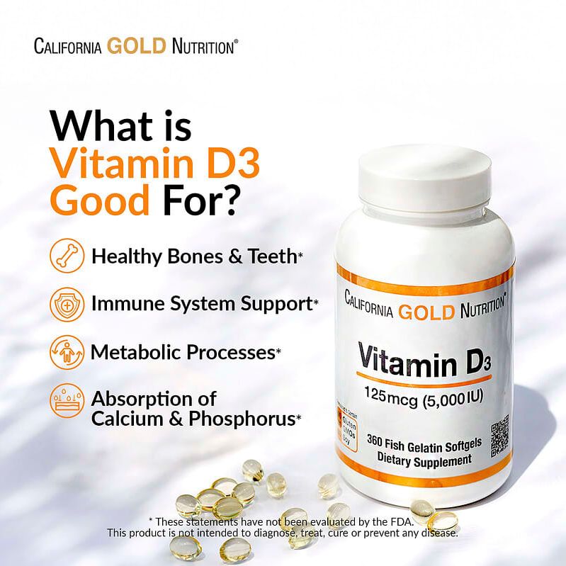 California Gold Nutrition® Vitamin D3, 125 mcg (5,000 IU) is a high-potency vitamin D supplement and contains cholecalciferol in fish gelatin softgels.