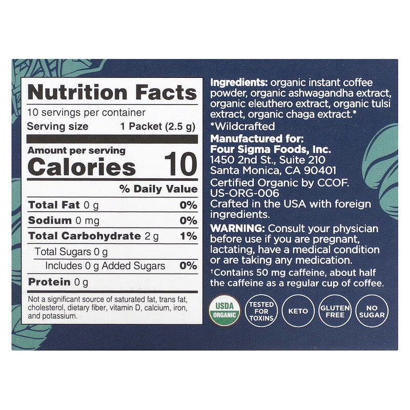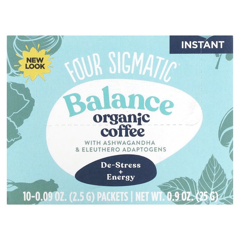 Four Sigmatic, Instant Organic Coffee with Ashwagandha & Eleuthero Adaptogens, Balance, Medium Roast, 10 Packets, 0.09 oz (2.5 g) Each