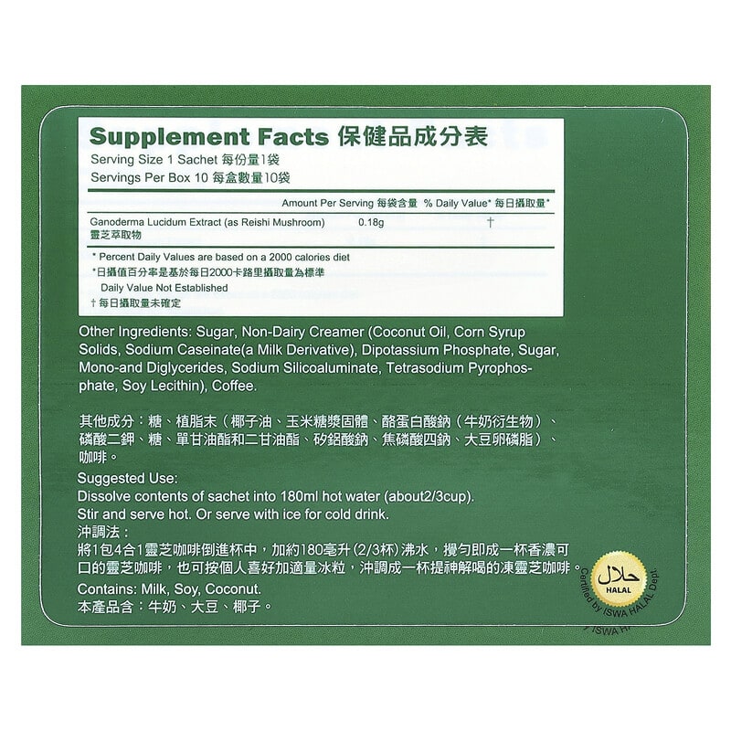Longreen, 4 in 1 Reishi Coffee, 10 Sachets, 6.35 oz (180 g)