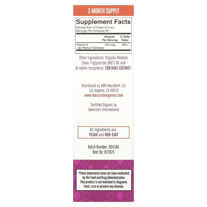 MaryRuth's, Organic Vitamin A Liquid Drops, Unflavored, 750 mcg, 1 fl oz (30 ml)