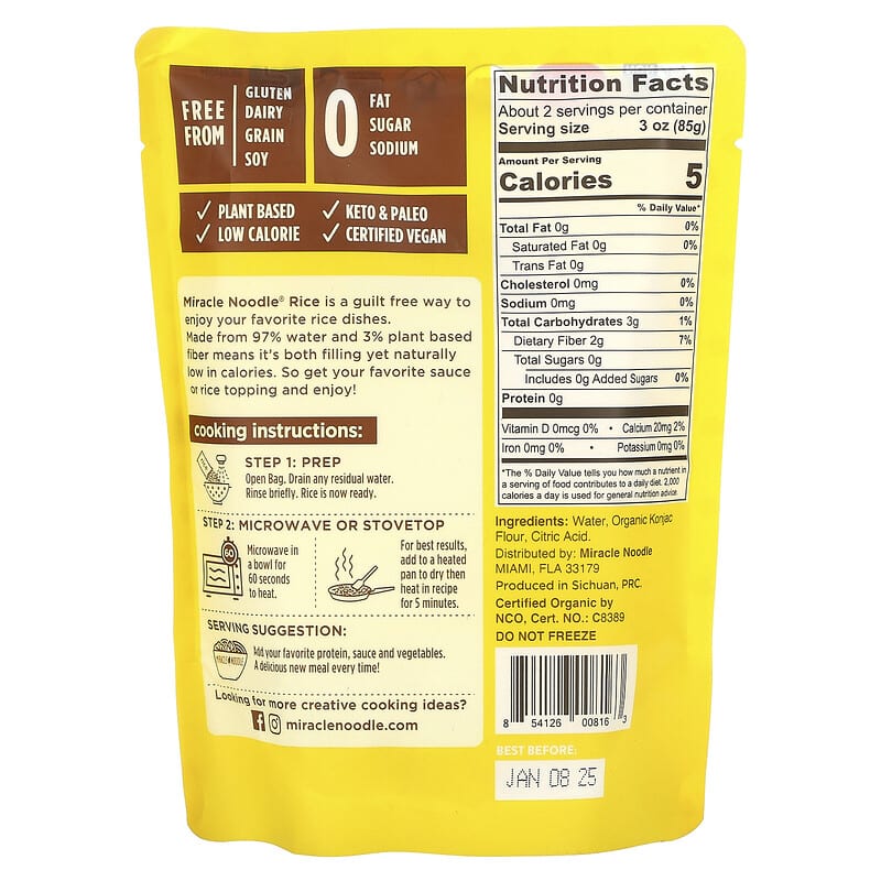 Miracle Noodle® Rice is a guilt free way to enjoy your favorite rice dishes. Made from 97% water and 3% plant based fiber means it's both filling yet naturally low in calories. So get your favorite sauce or rice topping and enjoy!