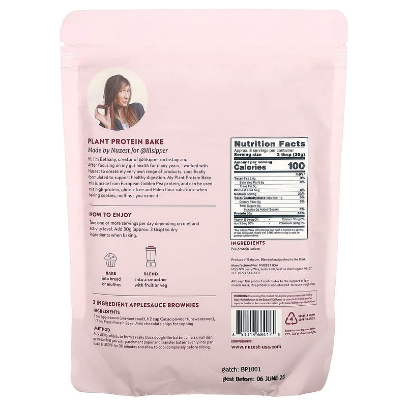 Made by Nuzest for @lilsipper Hi, I'm Bethany, creator of @lilsipper on Instagram. After focusing on my gut health for many years, I worked with Nuzest to create my very own range of products, specifically formulated to support healthy digestion. My Plant Protein Bake mix is made from European Golden Pea protein, and can be used as a high-protein, gluten-free and Paleo flour substitute when baking cookies, muffins - you name it!