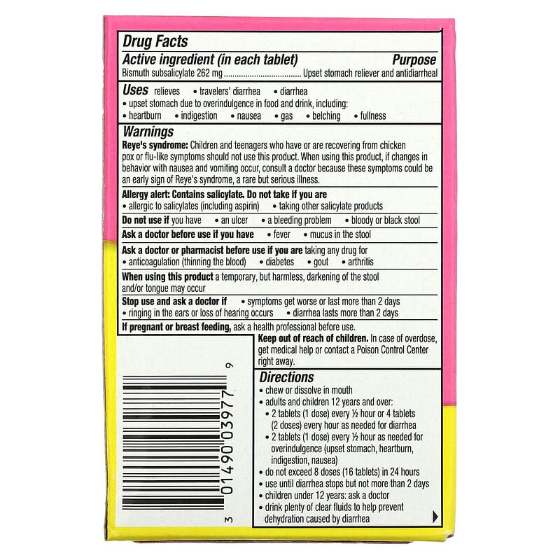 Bismuth subsalicylate 262 mg | Upset stomach reliever and antidiarrheal |