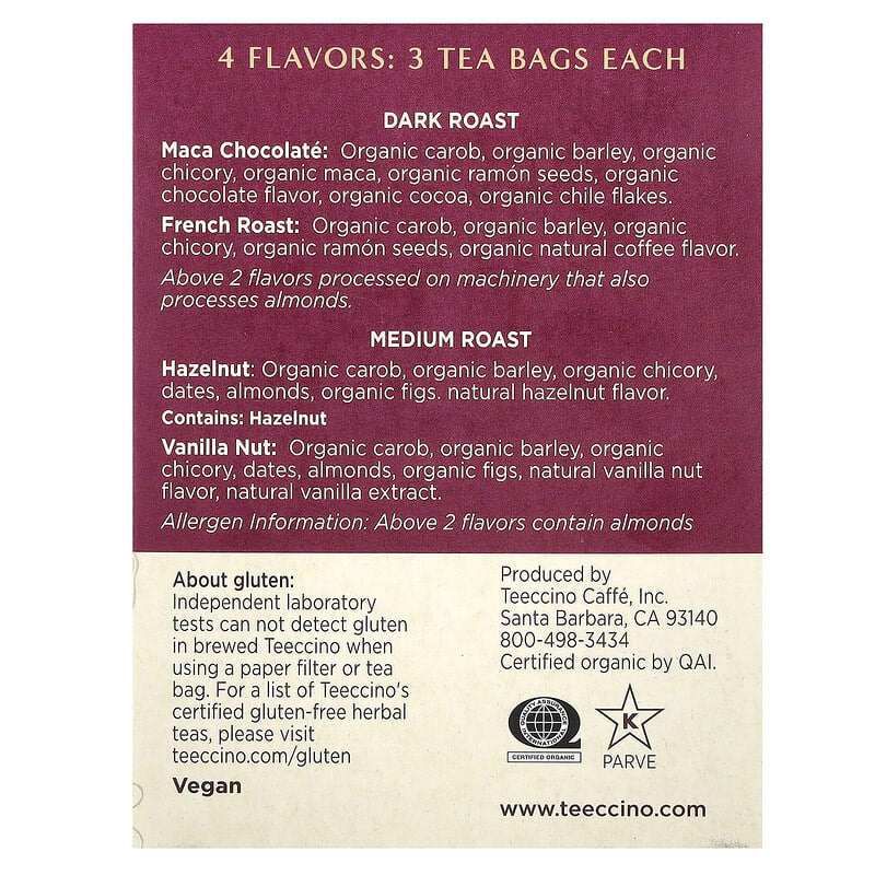 Teeccino, Roasted Herbal Tea Sampler, 4 Flavors, Caffeine Free, 12 Tea Bags, 2.54 oz (72 g)