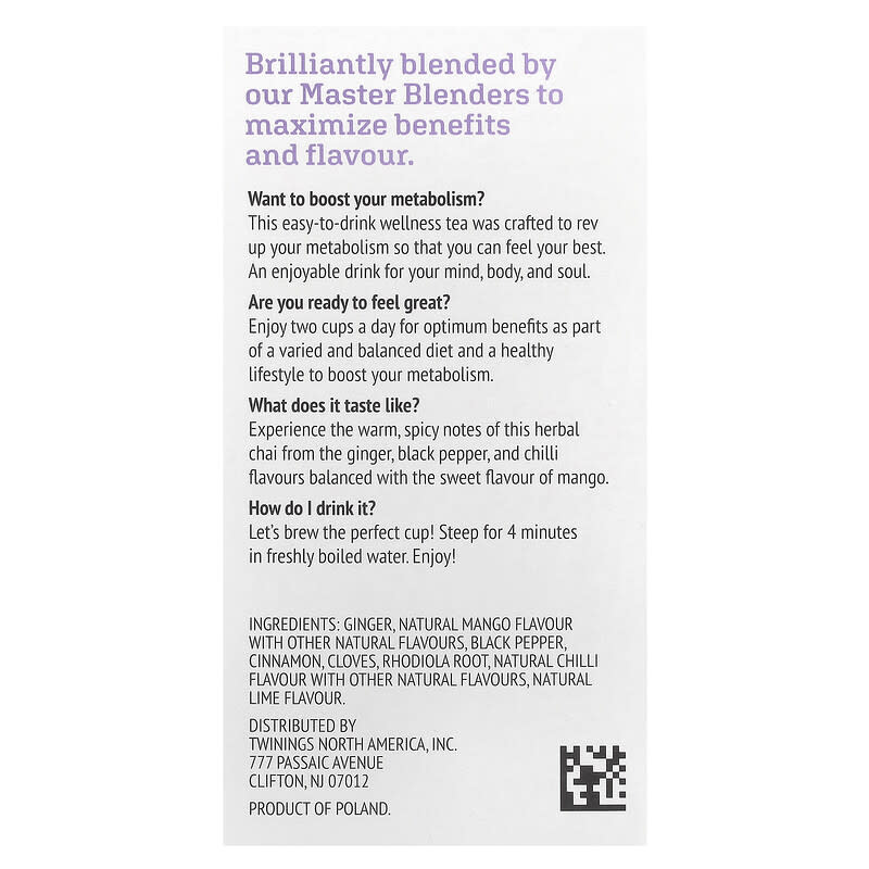 Twinings, Adaptogens Metabolism Herbal Tea, Caffeine-Free, Mango Chili Chai, 18 Tea Bags, 0.95 oz (27 g)