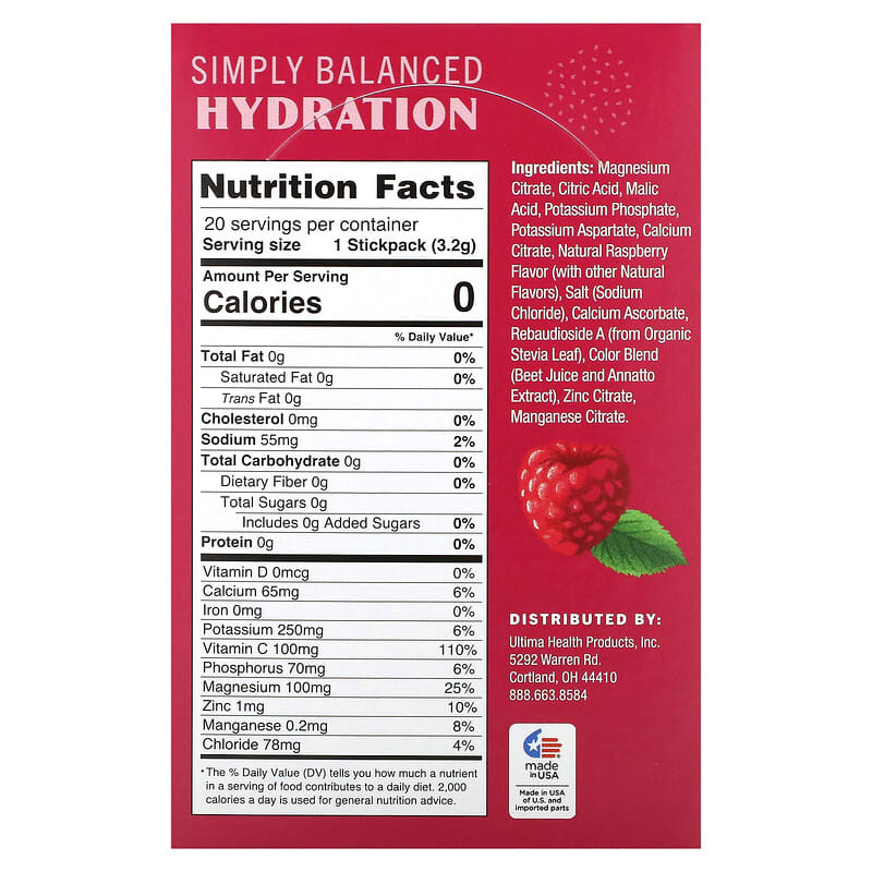 Magnesium citrate, citric acid, malic acid, potassium phosphate, potassium aspartate, calcium citrate, natural raspberry flavor (with other natural flavors), salt (sodium chloride), calcium ascorbate, rebaudioside a (from organic stevia leaf), color blend (beet juice and annatto extract), zinc citrate, manganese citrate.