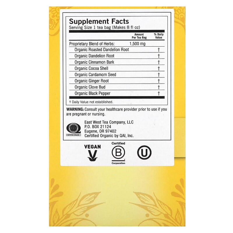 Formulated to support the body's natural cleansing processes, we combine Dandelion, traditionally used by herbalists to support liver health, with Cocoa Shell and Yogi's traditional spice blend. Enjoy a delicious cup of Roasted Dandelion Spice DeTox tea to help you feel refreshed and in balance.